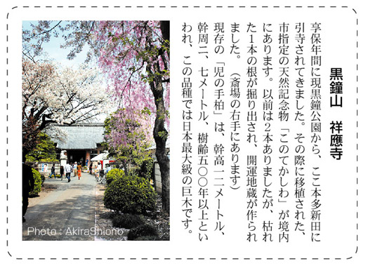 【エリア別商店会マップ3の訂正】 09/11/1発行の「あなたの街武蔵国分寺Part3」本多周辺マップにおきまして、 黒鐘山祥應寺の「児の手柏」の記事で、「樹 齢50年」とあるのは「樹齢500年」の誤りでした。ここにお詫びと訂正を申し上げます。